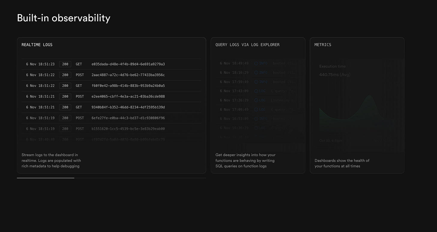 Supabase, the most widely adopted BaaS in the CodeGen ecosystem, makes this effortless. You can deploy an edge function globally, connect APIs, and monitor logs and metrics in real time — all from one dashboard. It’s flexible, scalable, and beginner-friendly for non-developers building with AI.