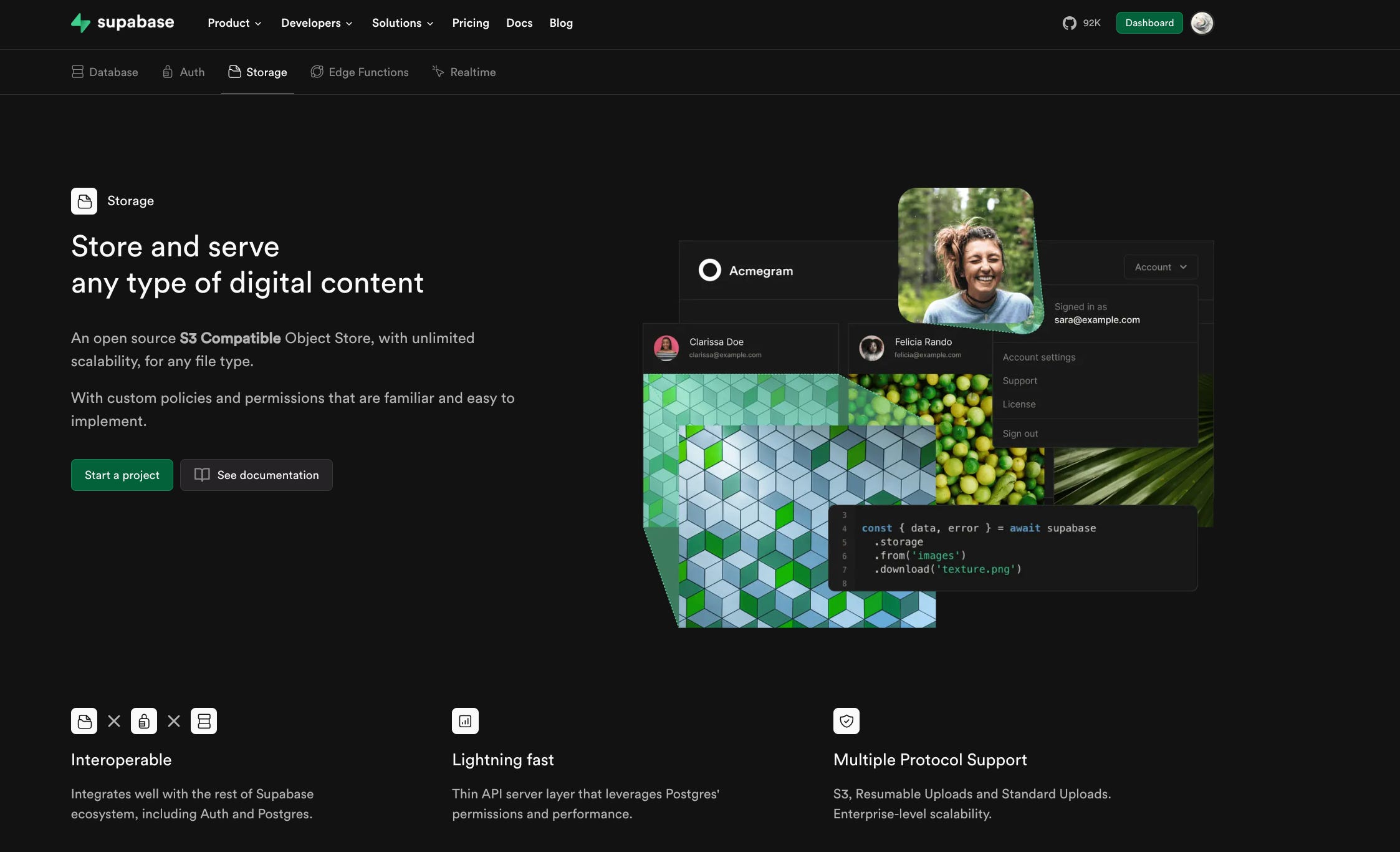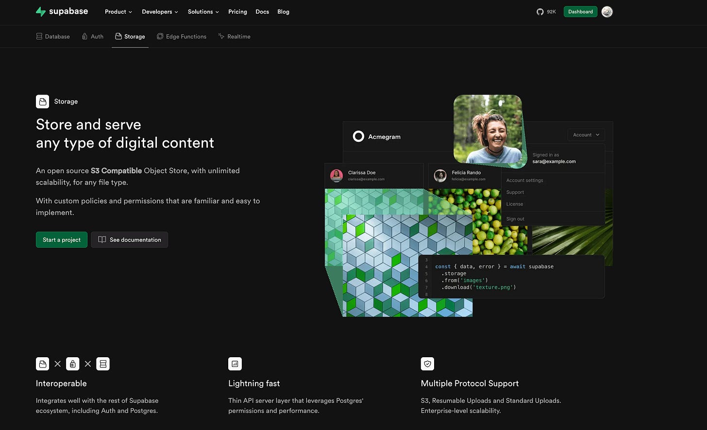 Its storage integrates smoothly with Supabase Auth and the same database you already use, ensuring that user permissions and file access remain in sync.
