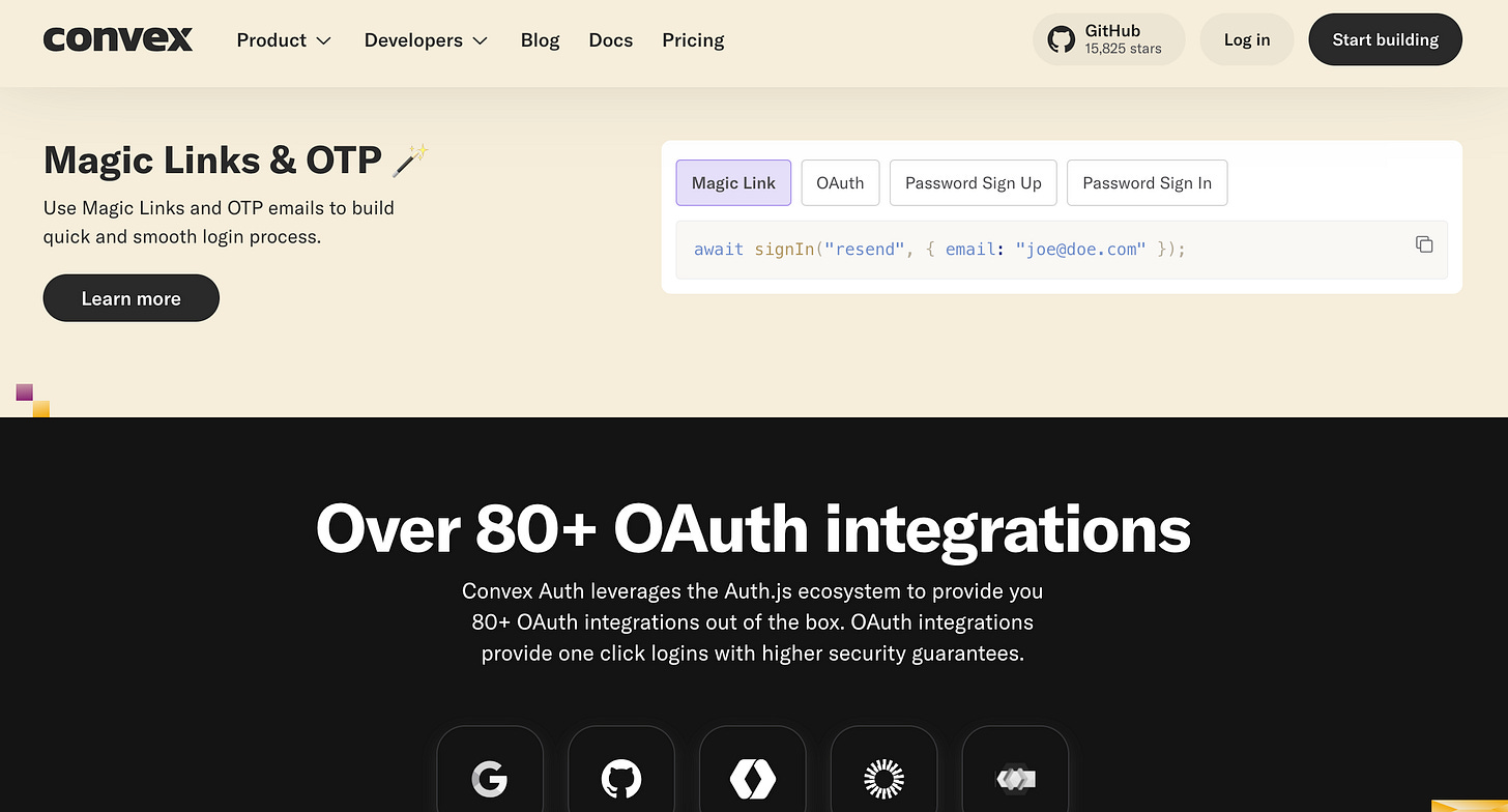 Convex Auth. Honorary mention. Useful if you are already using the Convex backend. Magic links and OAuth with a simple setup for over 80 integrations.
