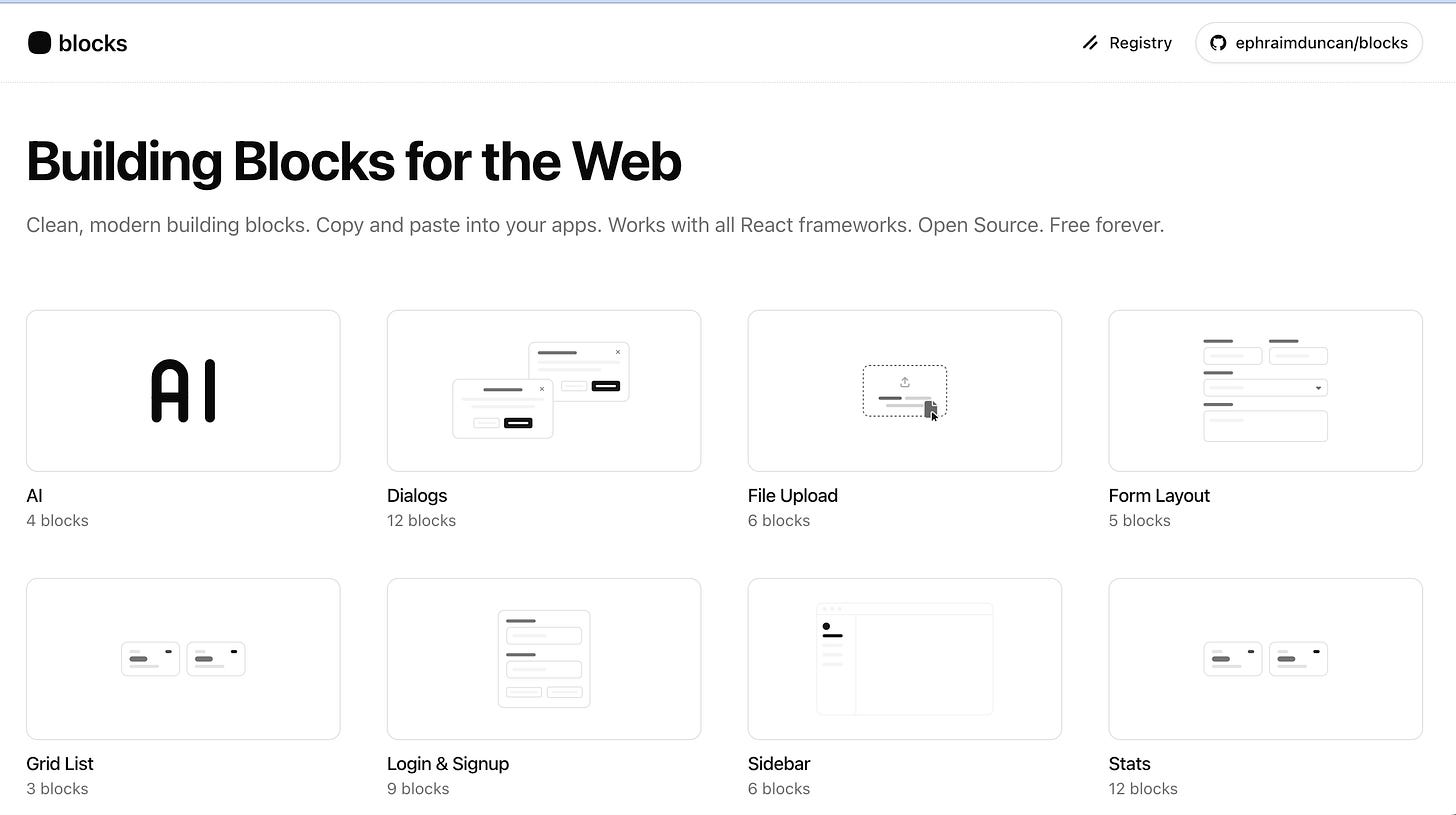 For ready-to-use UI building blocks, I recommend 21st.dev and the official Shadcn website, in addition to the sites dedicated to the derivatives.